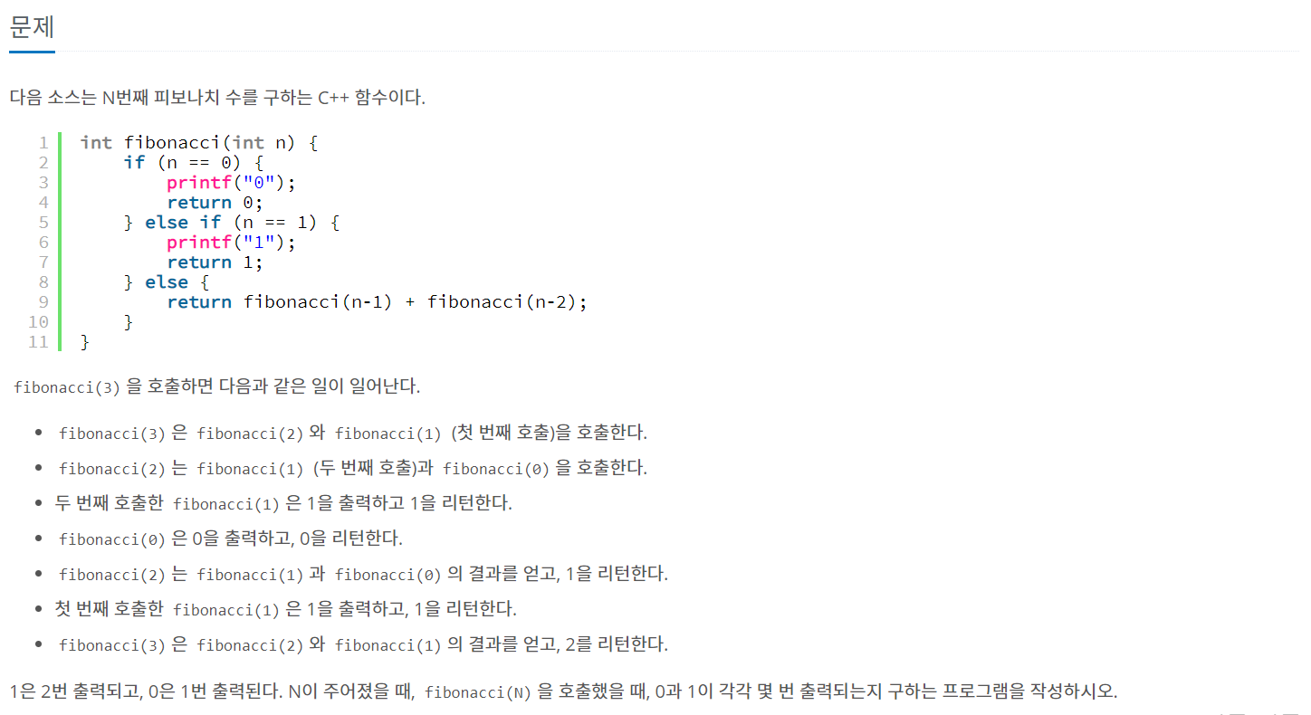 피보나치수열을 계산하는 함수 f(n) 을 수행했을때 호출되는 f(0), f(1) 의 개수를 정리한 표이다.