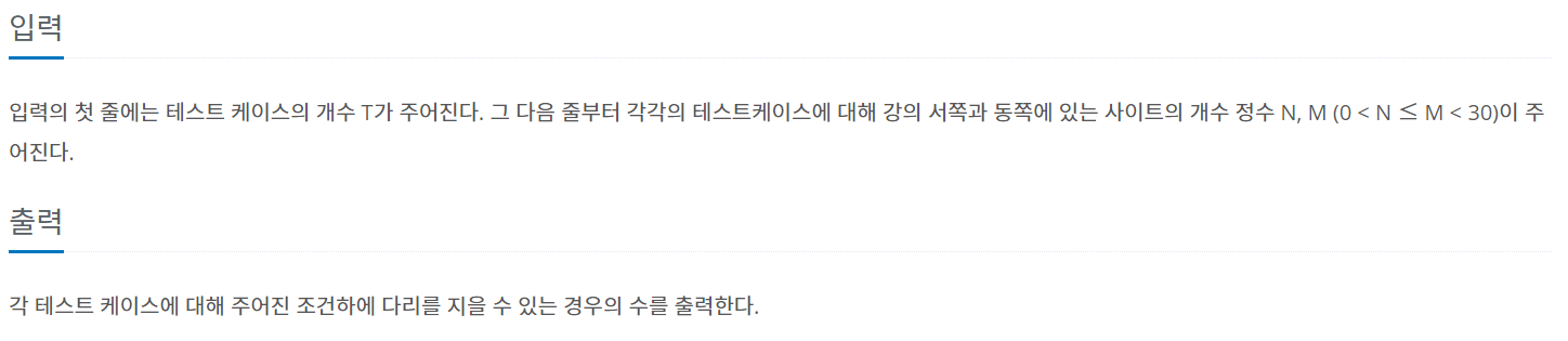 n이 2일땐 m이 증가함에 따라 dp[n][m] = dp[n][m-1] + dp[n-1][m-1] 의 형식으로 증가하는걸 볼 수 있다.