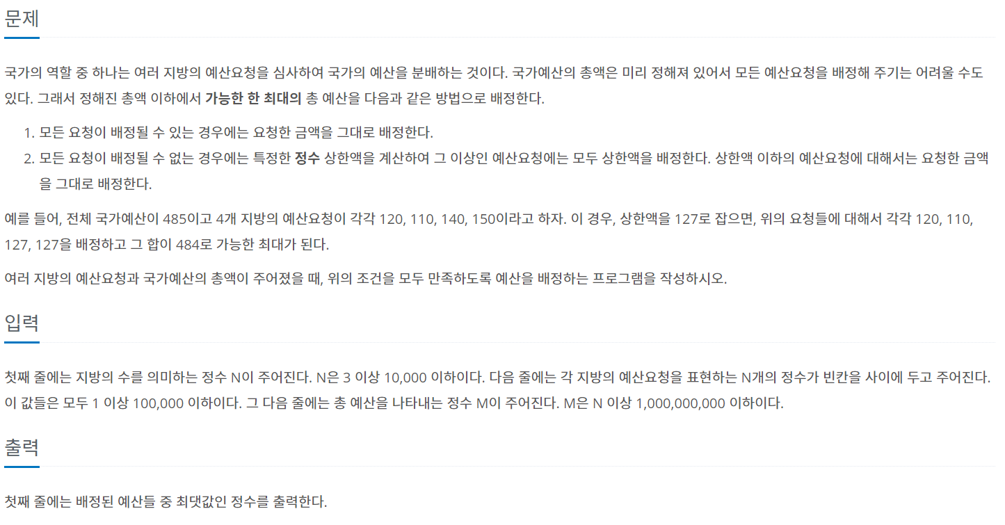 예산을 더하는 로직만 약간 다를뿐 이분탐색으로 접근하면 된다.