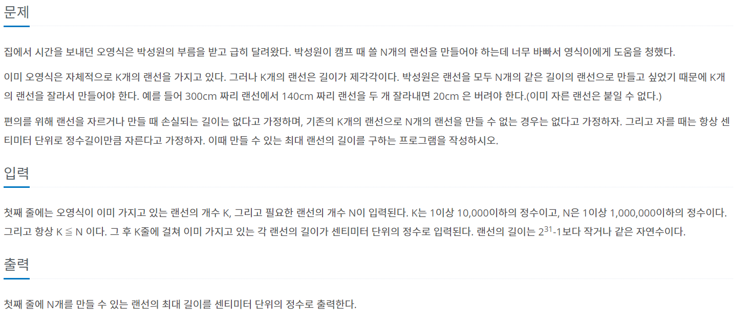 L / D 의 합이 K 를 만족하는 선에서 최대 길이를 구해야 한다.