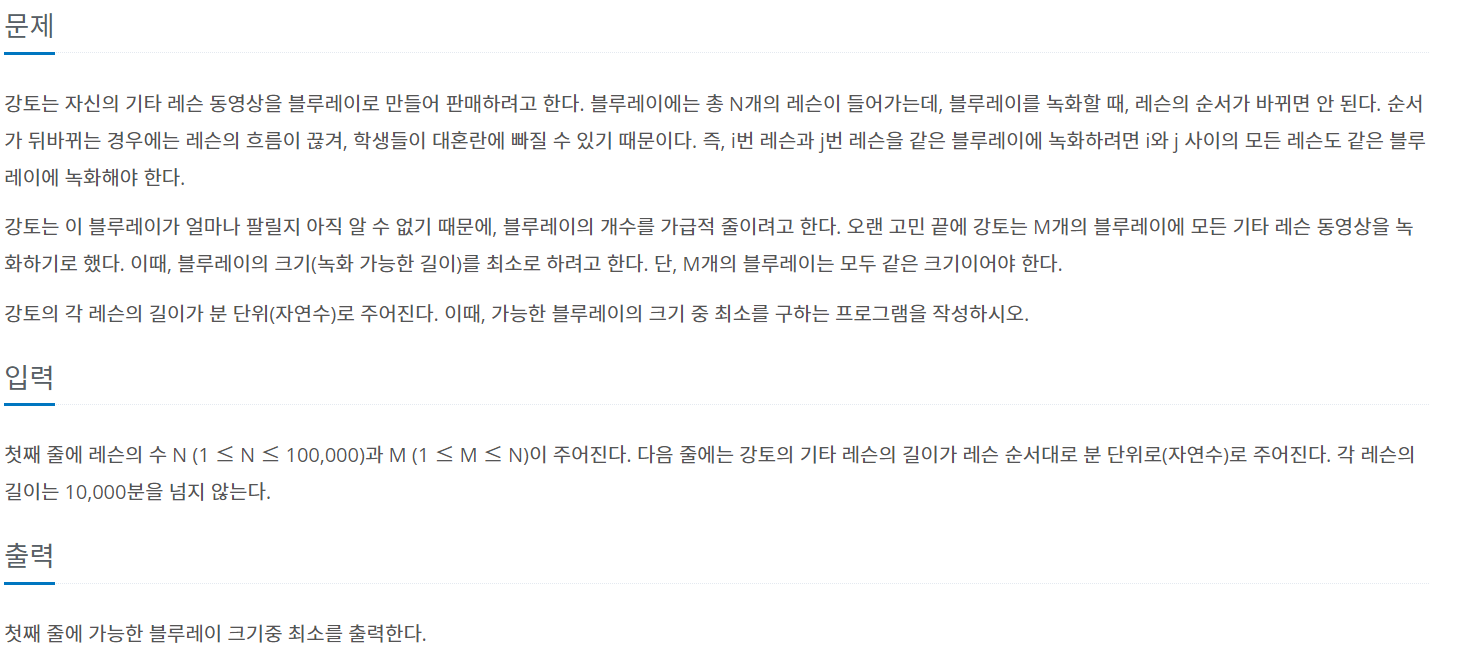 이분 탐색으로 문제에서 요구하는 블루레이 크기를 구하는 문제다.
