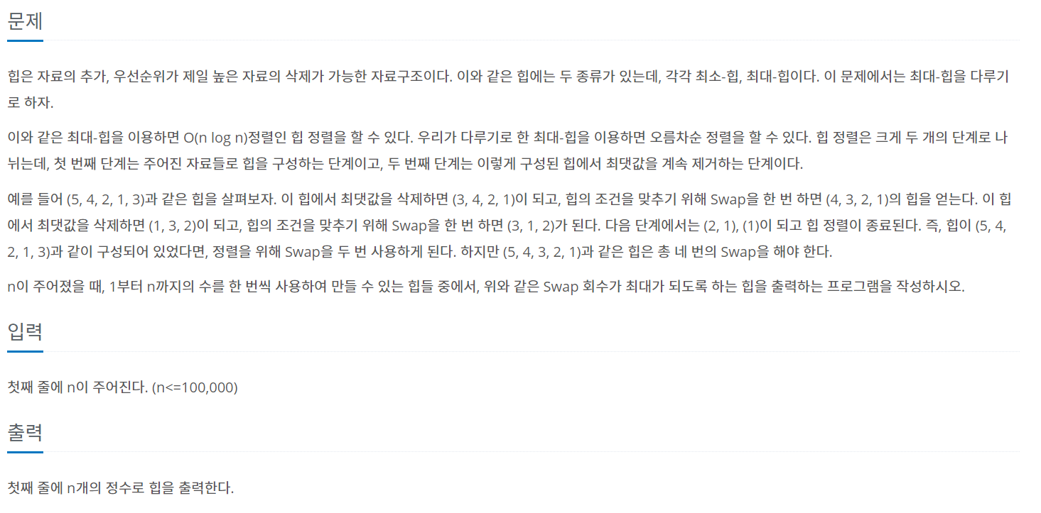 마지막으로 배열의 n 자리에 1을 넣어주면 스왑이 가장 많은 힙 구조가 완성된다.
