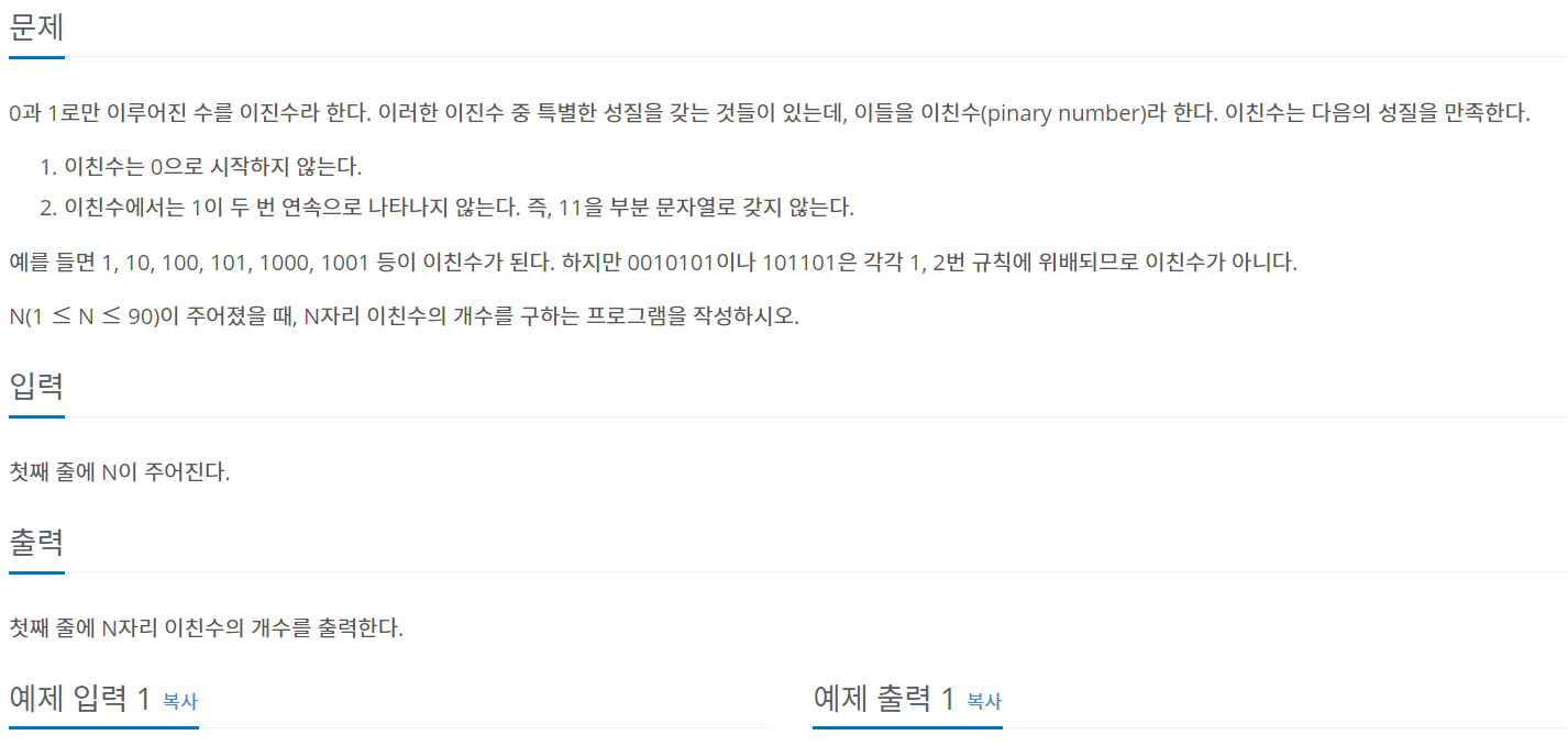 n자리 이친수의 개수를 세어보면 피보나치 수열이란 것을 알 수 있다.