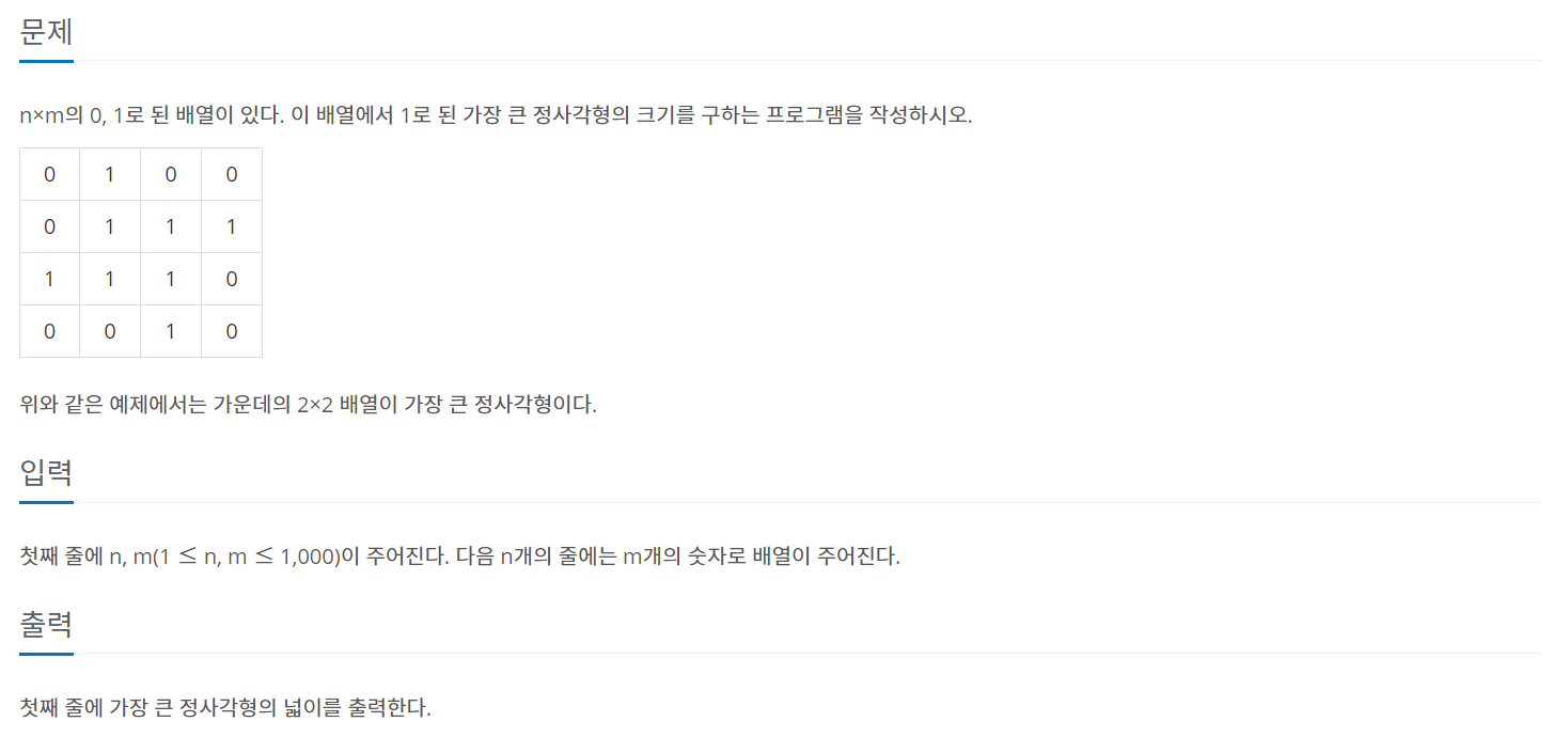 2. 정사각형의 조건을 만족하려면 가로, 세로의 길이가 같고 인접한 배열을 모두 1이어야 하므로