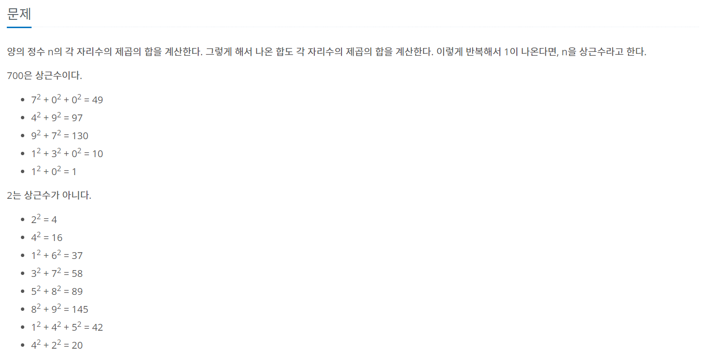 상근수가 아님을 알기위해 상근수 계산을 하며 구한값들을 집합에 담아 중복체크를 했다.
