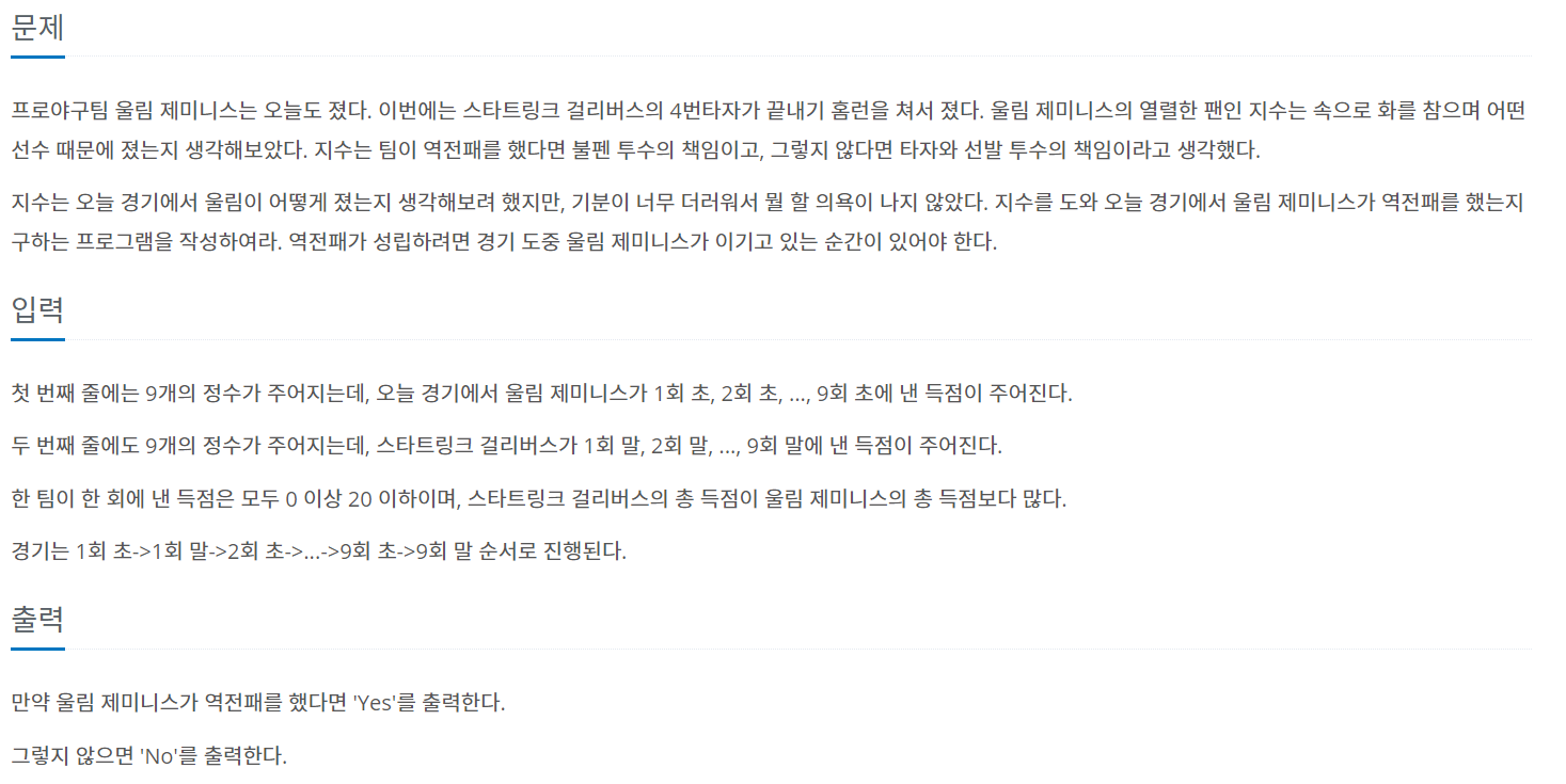1회초, 1회말 ...... 9회초, 9회말 순으로 점수를 비교하며 한번이라도 울림쪽이 이기고 있다면 Yes를 출력해주자.