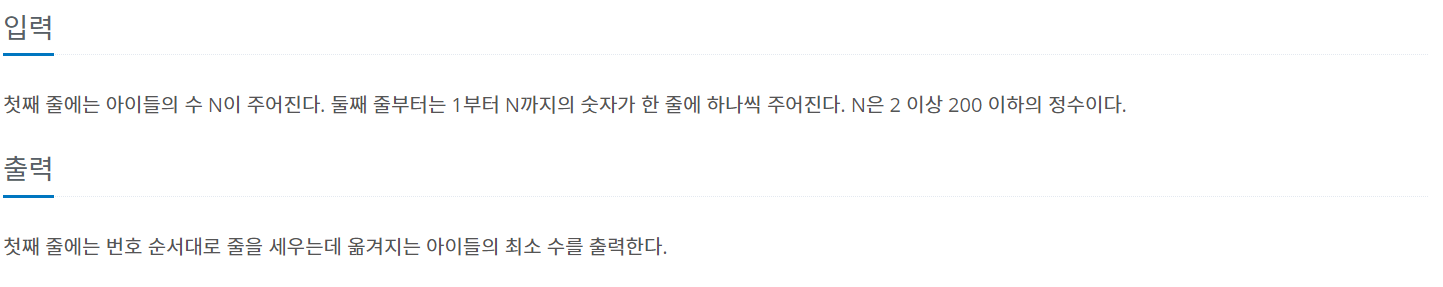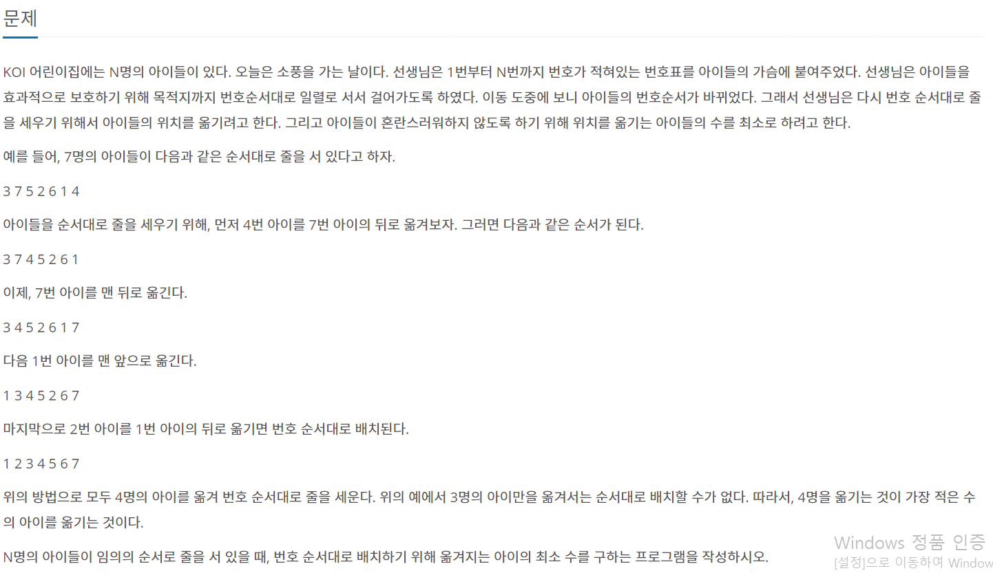 전체 아이의 수 - (가장 큰 증가 수열의 길이) 를 하면된다.