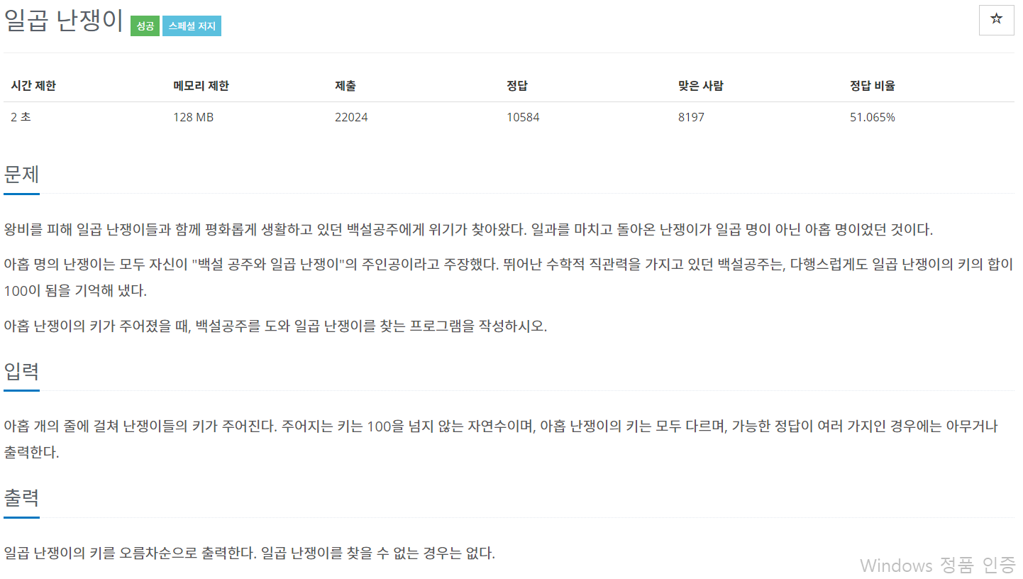 [백준 2309] 일곱 난쟁이 본문