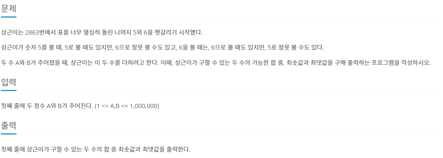 주어진 수에 6이 포함되면 5로 바꿔 최소값을 합치고, 5가 포함되면 6으로 바꿔 최대값끼리 합치면 된다.