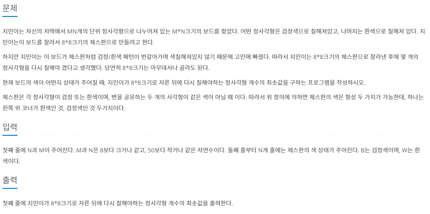 주어진 n*m의 배열에서 8*8 범위를 한칸씩 움직이면서 모두 검사한다.