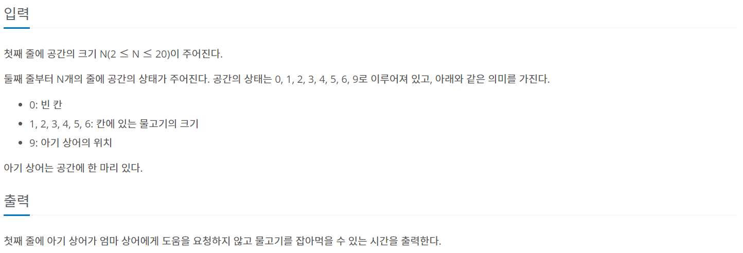 아기 상어가 도움을 요청하지 않고 사냥도 안하고 무한정 머무를 수 있으므로 문제에서 요구하는 것은